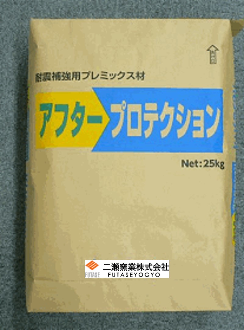 アフタープロテクションは、現場で水と混ぜることで必要量を作成でき配合管理も容易です。付着性能に優れたビニロン繊維を混入しひび割れ抑制効果も高めています。